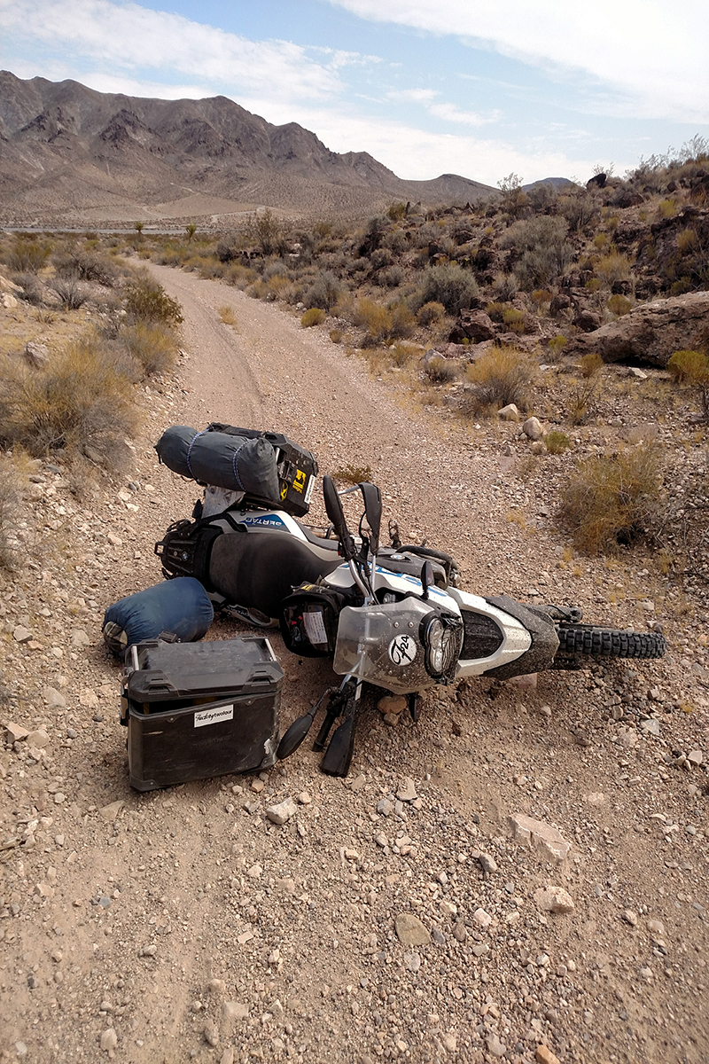 It was this stretch, this final stretch, where I really had fun. The dirt roads were excellent and allowed for 50 and even 60 mph in spurts, but moreover they were fun roads that the BMW could lean and buck with. 10 miles down, then 20, then finally 30 miles were consumed rapidly. With only five miles until re-entering tarmac, my final disaster struck. It was 3 PM, I was still low on calories, and I was mentally worn down from all the fast offroad riding and the impending end of the race. In the middle of wide-open track, with flat space surrounding me, I hit the only boulder around, smashed off my right-side pannier, spun the bike around and crashed hard. I was beside myself with fury and rather than attempt to fix anything decided to press on. I rode that fury through the last three miles of dirt, harnessed it on the Las Vegas freeway to zero in on The Bellagio at not-quite legal speeds, and finally felt it leave me, now more drained than before, as I approached the check-in counter at 4 PM, not sure what my fortune would be.