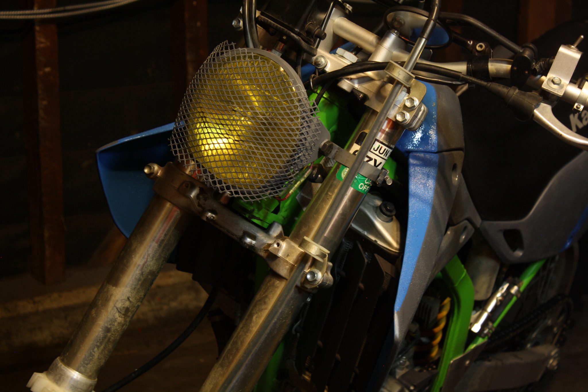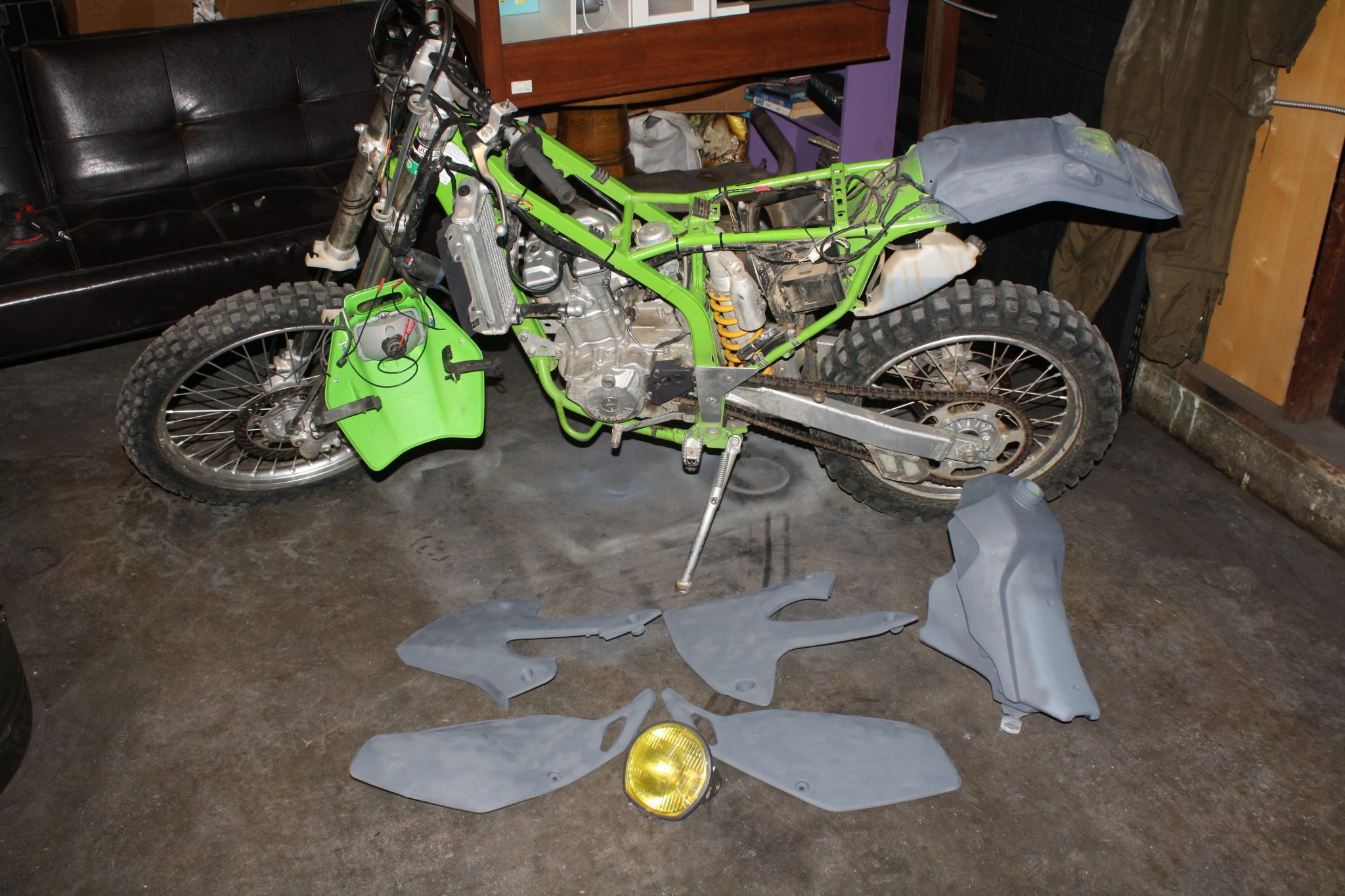 mind… Something like a salvaged Suzuki light from eBay, yellow film, and a rally cage. Stripped of everything, we started laying down some muted grey in healthy doses. I used more coats than was strictly necessary because this machine will be dropped frequently when off roading and needs to stand up to that abuse.