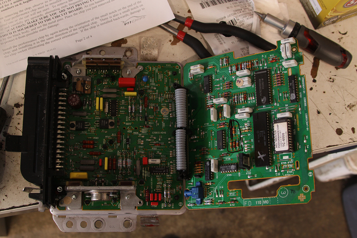 I haven’t done much to finesse the powertrain, save for installing a race exhaust and a performance chip. For the latter, that involved taking out the car’s ancient 1980’s computer, prying off a chip with a screwdriver (fancy!), and installing the 911 Chips doodad. Curiously, when I opened up my CPU I discovered that the car already had a performance chip from a lesser-known outfit installed. Nevertheless, 911 Chips is supposed to be the go-to chip supplier, so that’s what I installed. I’ll give it this, it smoothed the cold engine response and almost eliminated the exhaust drone in 2k-3k range. Well worth it.
