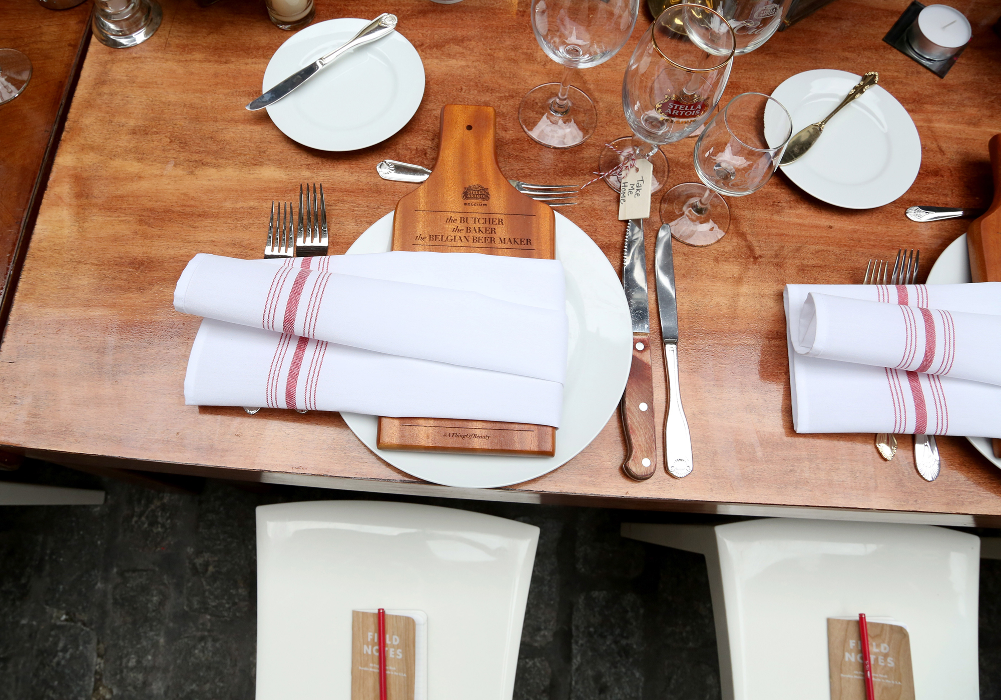 Guest were first treated to an open air “market” were they could snack on a selection of meats, cheeses, breads, and of course Stella Artois. Afterwords all were seated together for a three course dinner of dishes inspired by Teigen, LeeKong and Nicoletti, who were all present. An engraved cheeseboard at each place setting provided the guests with a unique keepsake as well as presented them with the menu consisting of an Heirloom Tomato Galette, Steak Frites and Belgian Apple Pastry. Naturally, each course was paired with Stella Artois with the exception of the third course which was accompanied by the brands Cidre.