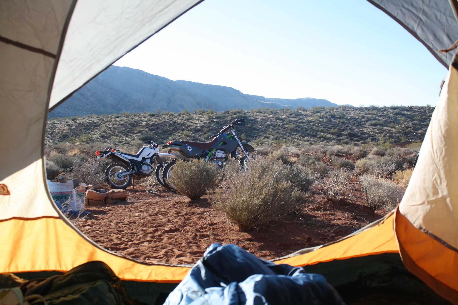 With 4 days away from the office to play with, we wisely chose to spend them offroading and camping in the high desert, complete with shit talking, s’mores, and red rocks. Fun! To be clear, up to this point we’d only been out 3 times on our bikes for about 4 hours at a time each. Just warmup rides really. And we’d be exhausted afterwards. So the prospect of 3 days with 8-12 hours of riding per day filled us (well at least me) with equal parts trepidation and concern. Nevertheless, we packed up our tents, marshmallows, and bikes and headed out of LA towards the border of Utah and Arizona.